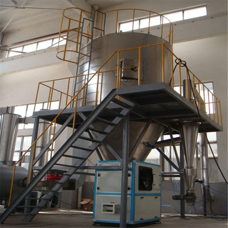 空氣經(jīng)過濾和加熱,進入干燥器頂部空氣分配器,熱空氣呈螺旋狀均勻地進入干燥室。料液經(jīng)塔體頂部的高速離心霧化器,(旋轉)噴霧成極細微的霧狀液珠,與熱空氣并流接觸在極短的時間內可干燥為成品。成品連續(xù)地由干燥塔底部和旋風分離器中輸出,廢氣由風機排空。