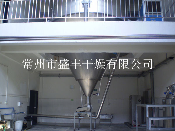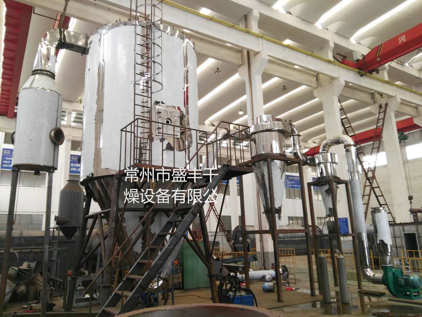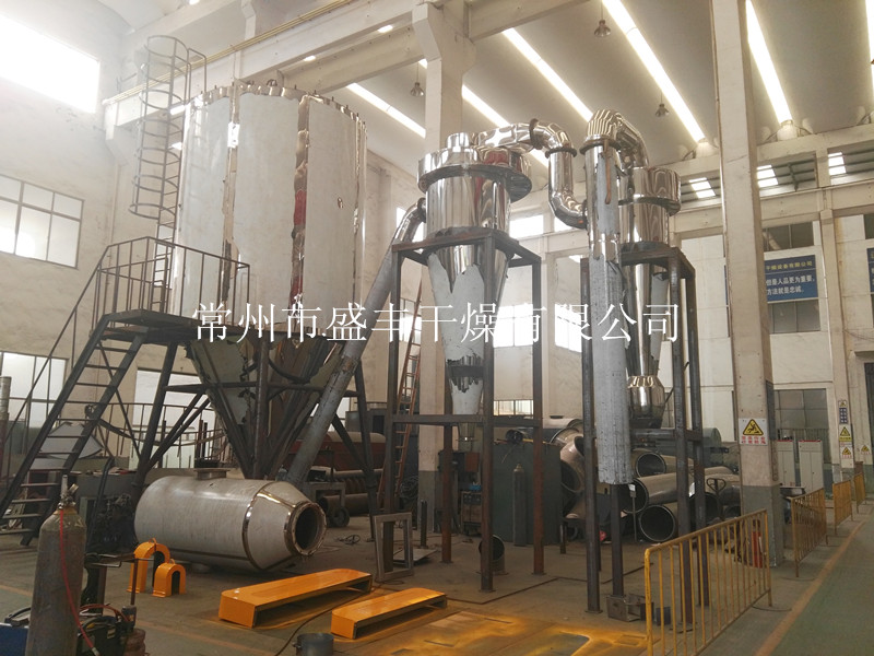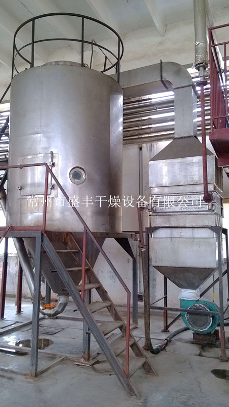 空氣經過濾和加熱,進入干燥器頂部空氣分配器,熱空氣呈螺旋狀均勻地進入干燥室。料液經塔體頂部的高速離心霧化器,(旋轉)噴霧成極細微的霧狀液珠,與熱空氣并流接觸在極短的時間內可干燥為成品。成品連續地由干燥塔底部和旋風分離器中輸出,廢氣由風機排空。
