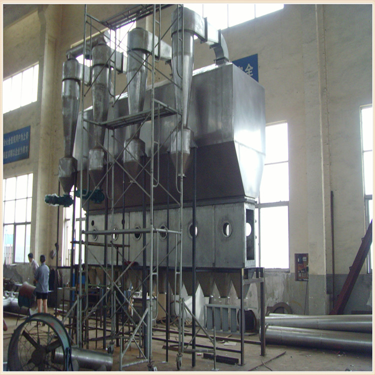 潔凈的熱風經閥板分配進入床體內,從加料器進入的濕物料被熱風形成沸騰狀態。由于熱風與物料廣泛接觸,增強了傳熱傳質的過程,因此在較短時間內就可干燥。如用連續型,物料從床體的一頭進入,經過幾十秒至幾分鐘沸騰干燥,自動從床體另一頭流出。本設備一般進行負壓操作。