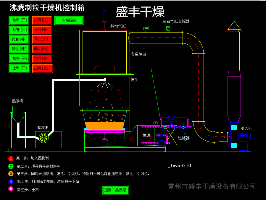 沸騰干燥機,又稱流化床干燥機,它是由空氣過濾器、加熱器、沸騰床主機,旋風分離器,布袋除塵器、高壓離心風機、操作臺組成,由于干燥物料的性質不同,配套除塵設備時,可按需要考慮,可同時選擇旋風分離器、布袋除塵器,也可選擇其中一種,一般來說比重較大的如沖劑及顆粒料干燥只需選擇旋風分離器,比重較輕的小顆粒狀和粉狀物料需配套布袋除塵器,并備有氣力送料裝置及皮帶輸送機供選擇。