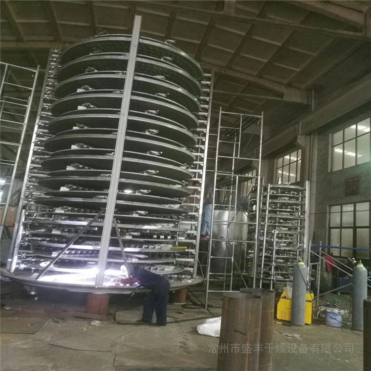 濕物料自加料器連續地加到干燥器上部一層干燥盤上,帶有耙葉的耙臂作回轉運動使耙臂作回轉運動使耙葉連續地翻抄物料。物料沿指數螺旋線流過干燥盤表面,在小干燥盤上的物料被移送到外緣,并在外緣落到下方的大干燥盤外緣,在大干盤上物料向里移動并從中間落料口落如下一層小干燥盤中。大小干燥盤上下交替排列,物料得以連續地流過整個干燥器。中空的干燥盤內通入加熱介質,加熱介質形式有飽和蒸汽、熱水和導熱油,加熱介質由干燥盤的一端進入,從另一端導出。已干物料從*后一層干燥盤落到殼體的底層,*后被耙葉移送到出料口排出。濕份從物料中逸出,由設在頂蓋上的排濕口排出,真空型盤式干燥器的濕氣由設在頂蓋上的真空泵口排出。從底層排出的干物料可直接包裝。通過配加翅片加熱器、溶劑回收冷凝器、袋式除塵器、干料返混機構、引風機等輔機,可提高其干燥的生產能力,干燥膏糊狀和熱敏性物 料,可方便地回收溶劑,并能進行熱解和反應操作。
