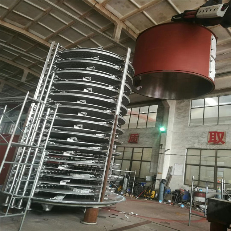 濕物料自加料器連續(xù)地加到干燥器上部di一層干燥盤上,帶有耙葉的耙臂作回轉(zhuǎn)運(yùn)動(dòng)使耙臂作回轉(zhuǎn)運(yùn)動(dòng)使耙葉連續(xù)地翻抄物料。物料沿指數(shù)螺旋線流過干燥盤表面,在小干燥盤上的物料被移送到外緣,并在外緣落到下方的大干燥盤外緣,在大干盤上物料向里移動(dòng)并從中間落料口落如下一層小干燥盤中。大小干燥盤上下交替排列,物料得以連續(xù)地流過整個(gè)干燥器。中空的干燥盤內(nèi)通入加熱介質(zhì),加熱介質(zhì)形式有飽和蒸汽、熱水和導(dǎo)熱油,加熱介質(zhì)由干燥盤的一端進(jìn)入,從另一端導(dǎo)出。已干物料從*后一層干燥盤落到殼體的底層,*后被耙葉移送到出料口排出。濕份從物料中逸出,由設(shè)在頂蓋上的排濕口排出,真空型盤式干燥器的濕氣由設(shè)在頂蓋上的真空泵口排出。從底層排出的干物料可直接包裝。通過配加翅片加熱器、溶劑回收冷凝器、袋式除塵器、干料返混機(jī)構(gòu)、引風(fēng)機(jī)等輔機(jī),可提高其干燥的生產(chǎn)能力,干燥膏糊狀和熱敏性物 料,可方便地回收溶劑,并能進(jìn)行熱解和反應(yīng)操作。