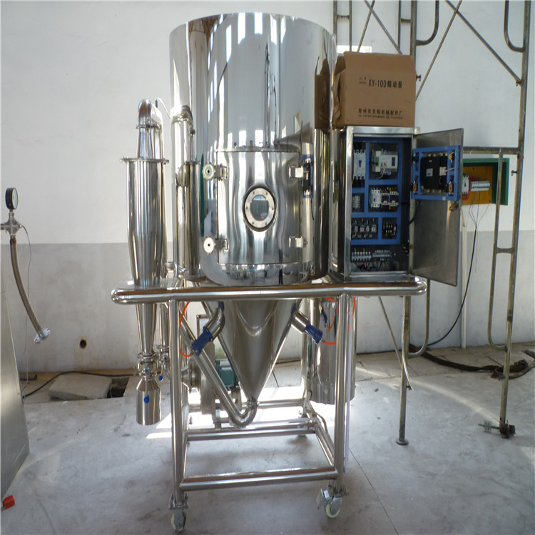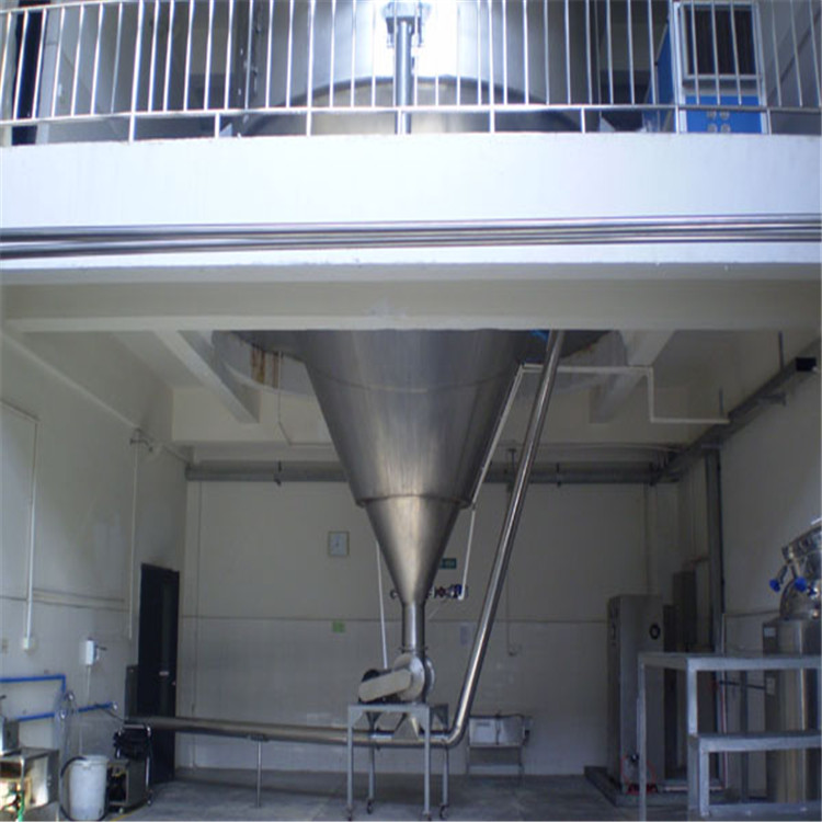 空氣經過濾和加熱,進入干燥器頂部空氣分配器,熱空氣呈螺旋狀均勻地進入干燥室。料液經塔體頂部的高速離心霧化器,(旋轉)噴霧成極細微的霧狀液珠,與熱空氣并流接觸在極短的時間內可干燥為成品。成品連續地由干燥塔底部和旋風分離器中輸出,廢氣由風機排空。