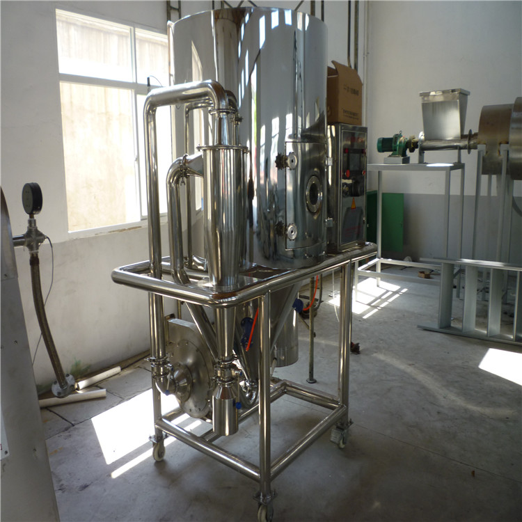 空氣經過濾和加熱,進入干燥器頂部空氣分配器,熱空氣呈螺旋狀均勻地進入干燥室。料液經塔體頂部的高速離心霧化器,(旋轉)噴霧成極細微的霧狀液珠,與熱空氣并流接觸在極短的時間內可干燥為成品。成品連續地由干燥塔底部和旋風分離器中輸出,廢氣由風機排空。