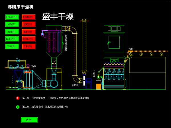 散粒狀固體物料由加料器加入流化床干燥器中,過濾后的潔凈空氣加熱后由鼓風機送入流化床底部經分布板與固體物料接觸,形成流態化達到氣固的熱質交換。物料干燥后由排料口排出,廢氣由沸騰床頂部排出經旋風除塵器組和布袋除塵器回收固體粉料后排空。